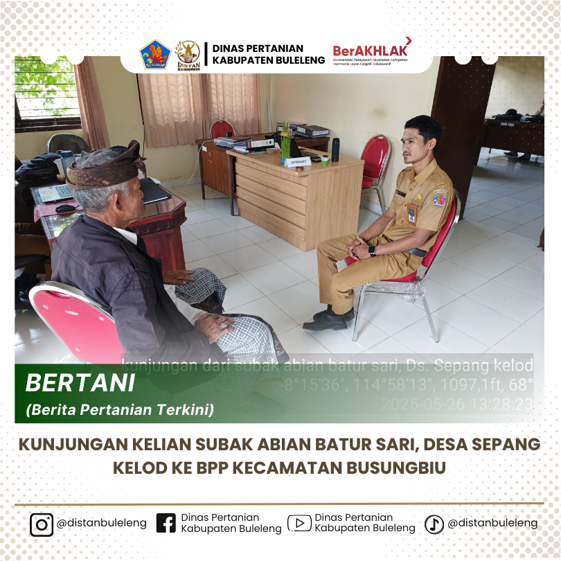 Pembinaan kepada kelompok tani sebagai wadah yang merangkum aspirasi para petani di suatu wilayah, salah satunya wilayah binaan Desa Sepang Kelod, Kecamatan Busungbiu. Pada hari ini, Senin, 26 Mei 2025, petugas penyuluh pertanian wilayah binaan Desa Sepang Kelod menerima kunjungan dari salah satu ketua kelompok Subak Abian Batur Sari, Desa Sepang Kelod atas nama I Gusti Ngurah Dharma Agung. Kunjungan yang dilaksanakan membahas berbagai hal diantaranya struktur kelembagaan dalam subak, komoditas yang diusahakan oleh anggota, rencana pengajuan erdkk tahun 2025 serta memohon informasi perihal rencana pengajuan bantuan pupuk organic dan bantuan pengadaan bibit kopi robusta dengan system stek rest, klon BP308. Harapannya pembinaan dari petugas penyuluh pertanian dapat meningkatkan semangat kerja petani dan kapasitas kelembagaan tani menuju kesejahteraan anggota