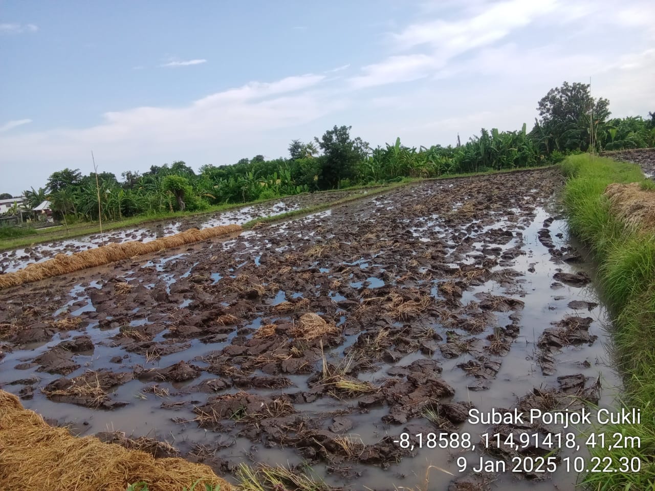 Pengolahan lahan untuk tanaman padi pada hari ini adalah merupakan pengolahan lahan pertama di Subak Ponjok Cukli di Musim Tanam I th 2025 dengan luasan olahan lahan pada hari seluas 5 ha dari total luasan 15 ha. Varietas yang rencana akan ditanam adalah varietas Inpari 32 dengan menggunakan sistem tanam tegel.