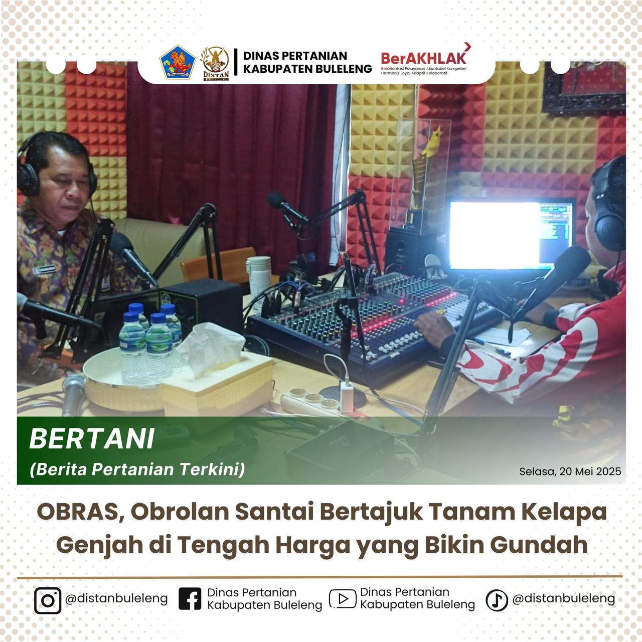 Selasa, 20 Mei 2025 — Kepala Dinas Pertanian Kabupaten Buleleng, Gede Melandrat, SP, menjadi narasumber dalam program "Obras" (Obrolan Santai) di Radio Nuansa Giri FM. Acara ini mengangkat topik "Tanam Kelapa Genjah di Tengah Harga yang Bikin Gundah," membahas strategi pertanian berkelanjutan di tengah fluktuasi harga komoditas.