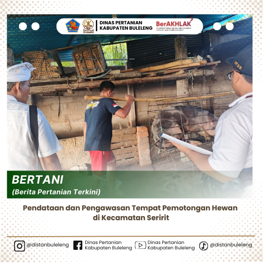 Pada hari ini, Senin 8 september 2025, Medik Veteriner Bidang Peternakan dan Kesehatan Hewan, Dinas Pertanian Kabupaten Buleleng, melaksanakan kegiatan pendataan dan pengawasan terhadap tempat pemotongan hewan di Kecamatan Seririt. Kegiatan ini dilaksanakan pada tempat pemotongan babi yang ada di wilayah tersebut, sebagai langkah antisipasi dalam rangka menyambut Hari Raya Pagerwesi yang akan jatuh pada hari Rabu mendatang.