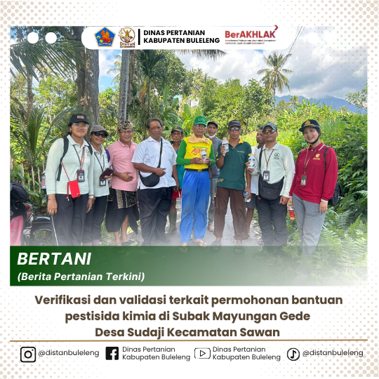 Rabu, 16 Juli 2025 dilaksanakan verifikasi dan validasi terkait permohonan bantuan pestisida kimia di Subak Mayungan Gede Desa Sudaji berdasarkan hasil pengamatan OPT yang dilakukan POPT Sawan dan PPL Wilbin Desa Sudaji sesuai dengan surat permohonan dari Koordinator BPP Kecamatan Sawan Nomor 30/VII.2025/BPP Sawan.