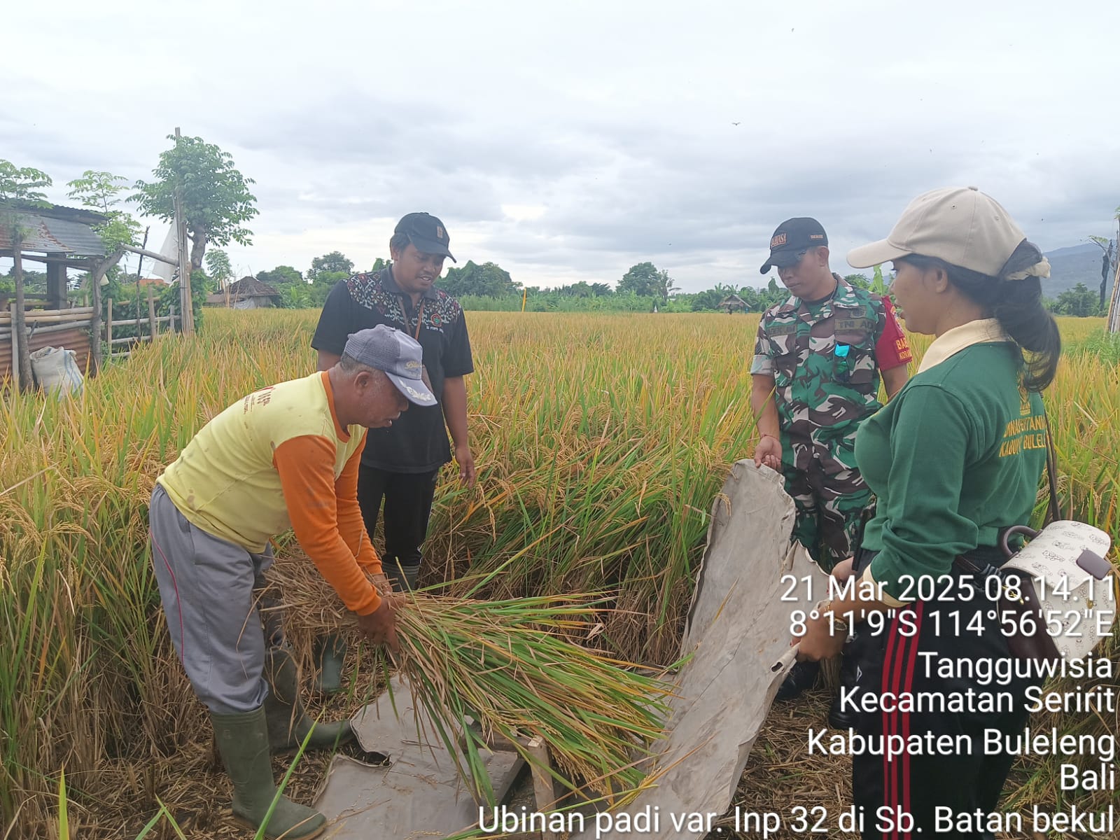Kegiatan pengambilan ubinan tanaman padi dengan varietas Inpari 32 di Subak Batan bekul, Desa Tangguwisia. Dinas Pertanian Kabupaten Buleleng yang diwakili oleh PPL Desa Tangguwisia (Ibu Kadek Justikha Natalia Praja), Petugas Data, POPT Kecamatan Seririt, Kelian Subak (Bapak Ketut Wartana), serta Babinsa Desa Tangguwisia (Bapak Serma Kadek Jim Nana). Jumat, 21 Maret 2025