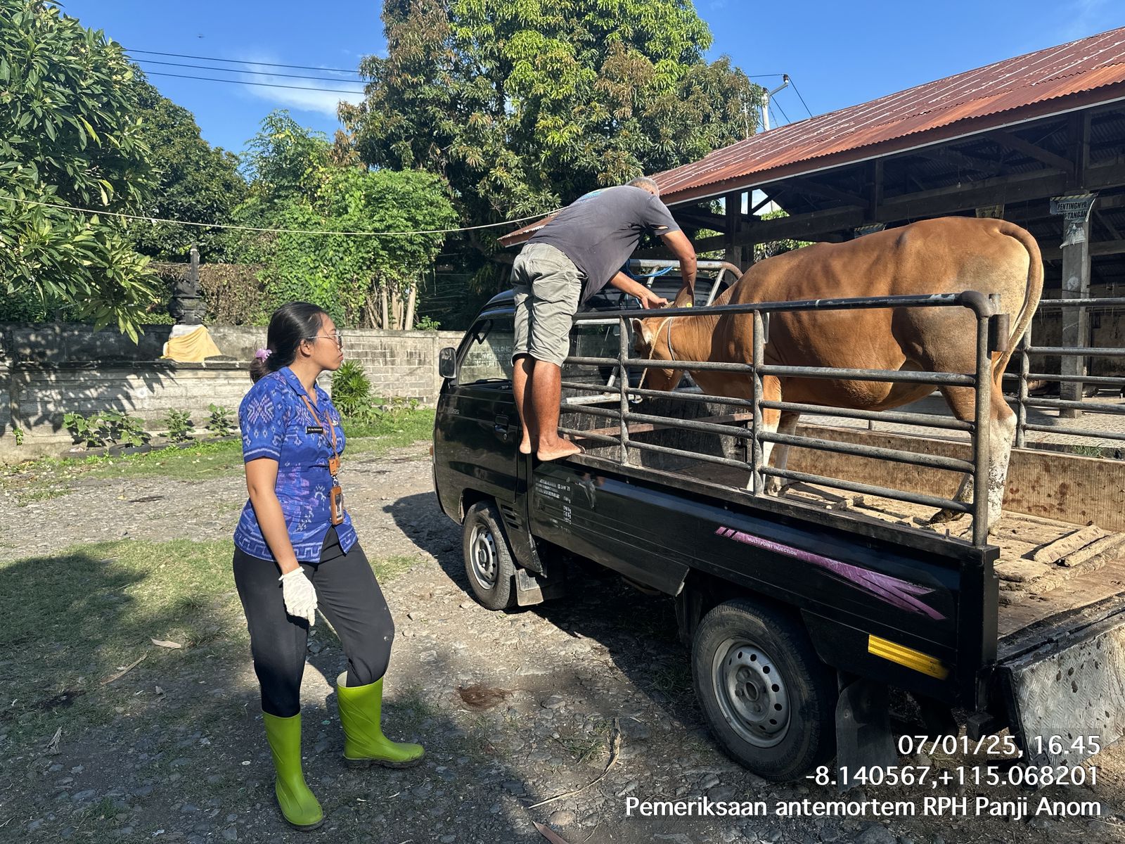 Pada hari Selasa, 7 Januari 2025 Bidang Peternakan dan Kesehatan Hewan Dinas Pertanian Kabupaten Buleleng melaksanakan Pemeriksaan ante mortem atau pemeriksaan kesehatan hewan sebelum disembelih merupakan langkah penting yang dilakukan di Rumah Pemotongan Hewan (RPH) Buleleng untuk menjamin keamanan dan kualitas daging yang akan dikonsumsi oleh masyarakat. Kegiatan ini dilakukan setiap hari oleh petugas kesehatan hewan yang terlatih, guna memastikan hanya hewan yang sehat yang dapat diproses untuk konsumsi.