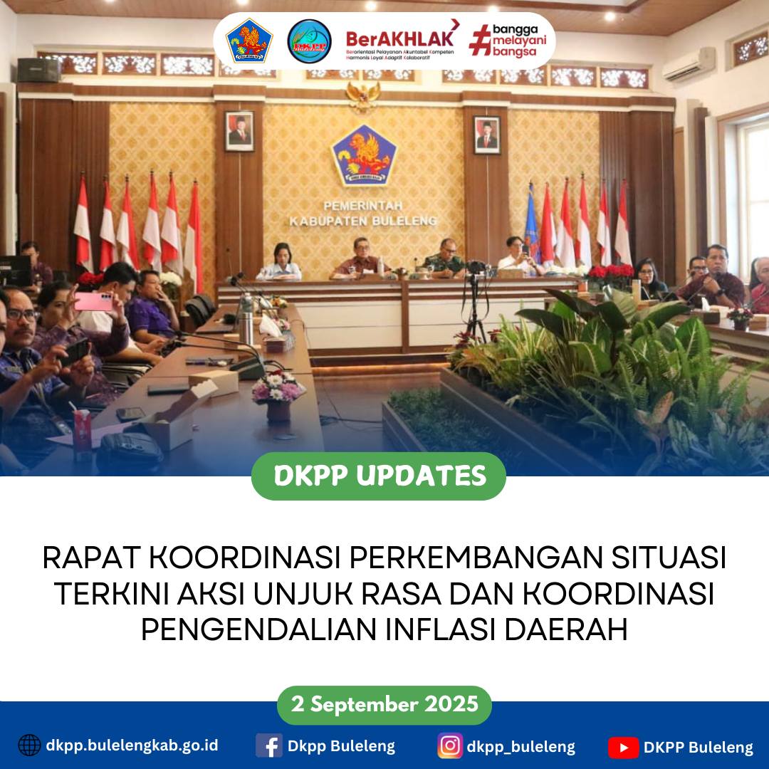 Selasa, 2 September 2025 - Bertempat di Ruang Rapat Kantor Bupati Buleleng, Kepala Dinas Ketahanan Pangan dan Perikanan Kabupaten Buleleng I Gede Putra Aryana, S.Sos., MAP. bersama Kabid Ketersediaan dan Kerawanan Pangan mengikuti Zoom Meeting Rapat Koordinasi Perkembangan Situasi Terkini Aksi Unjuk Rasa dan Koordinasi Pengendalian Inflasi Daerah yang dipimpin Menteri Dalam Negeri Republik Indonesia dengan melibatkan unsur dari Kementerian/Lembaga, serta Instansi Perangkat Daerah ditingkat Provinsi maupun Kabupaten/Kota se-Indonesia.