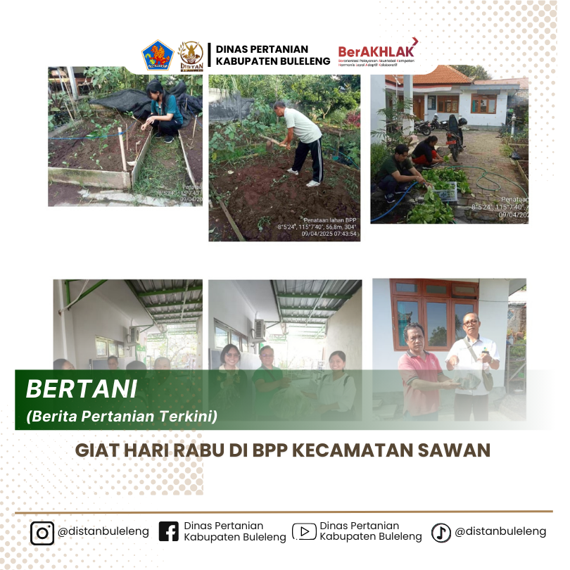 Hari ini Rabu 9 April 2025 telah dilaksanakan beberapa kegiatan pemeliharaan tanaman pada lahan pekarangan BPP Sawan. Kegiatan yang dilaksanakan oleh seluruh pegawai pertanian antara lain