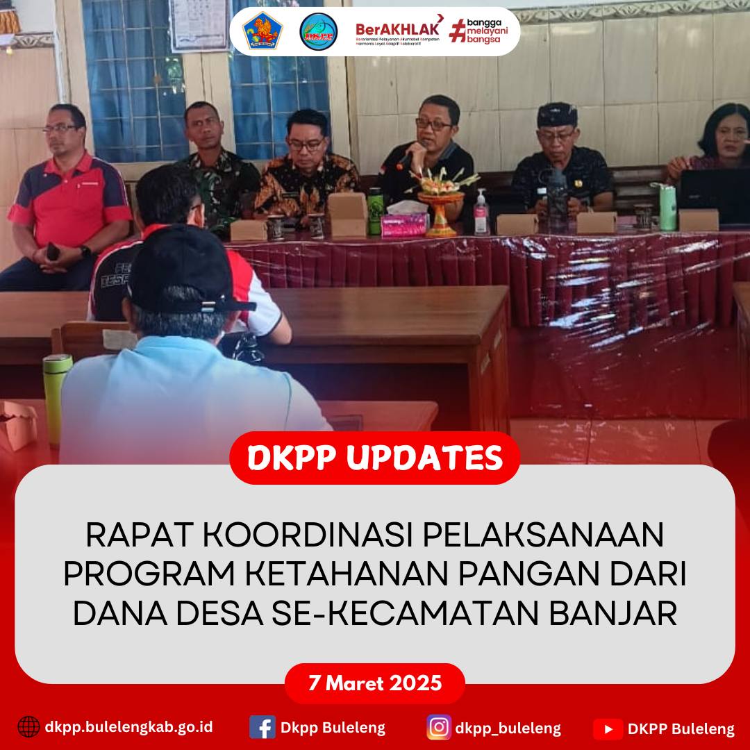 Jumat, 7 Maret 2025 - Kepala Dinas Ketahanan Pangan dan Perikanan (DKPP) Kabupaten Buleleng I Gede Putra Aryana, S.Sos., MAP. menghadiri Rapat Koordinasi (Rakor) Pelaksanaan Program Ketahanan Pangan dari Dana Desa bersumber pada APBDes 2025 melalui BUMdes di wilayah Kecamatan Banjar.