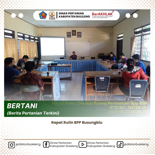 Busungbiu, 7 Oktober 2025 Balai Penyuluhan Pertanian (BPP) Busungbiu melaksanakan rapat rutin mingguan yang dihadiri oleh Penyuluh Pertanian Lapangan (PPL), staf BPP, Petugas Pengendali Organisme Pengganggu Tumbuhan (POPT), serta Dokter Hewan Kecamatan Busungbiu.