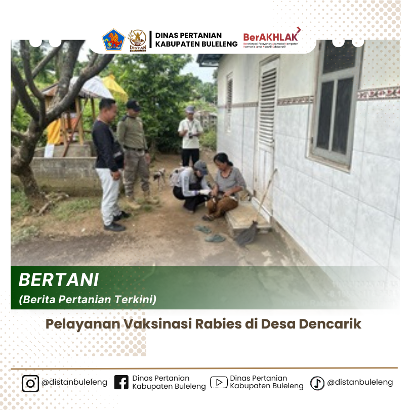 Kamis, 10 April 2025 tim vaksinasi yang terdiri atas dokter hewan petugas Puskeswan Kecamatan Banjar dan PPL (Penyuluh Pertanian Lapang) melaksanakan pelayanan vaksinasi rabies di Desa Dencarik Banjar Dinas Corot. Sebelumnya tim vaksinasi telah berkoordinasi dengan Perbekel Desa Dencarik agar dapat menyebarluaskan informasi terkait adanya vaksinasi massal di desa. Didampingi oleh Tisira Desa Dencarik yaitu Kepala Dusun Banjar Dinas Corot dan staf desa, pelayanan vaksinasi dilakukan dengan menyasar masyarakat yang memiliki HPR (hewan penular rabies), seperti anjing, kucing, dan kera.