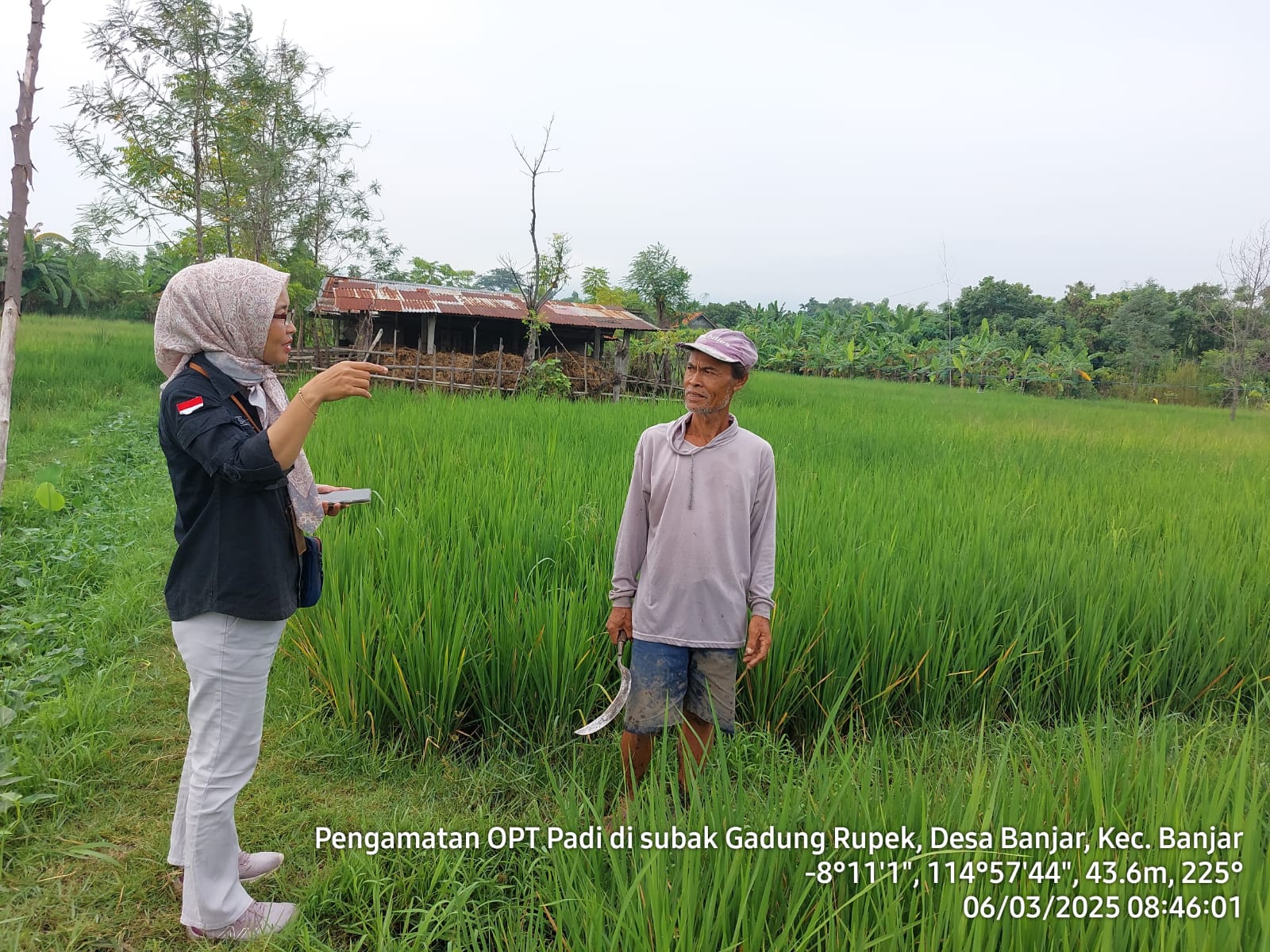 Pengamatan OPT/DPI pada tanaman padi dilaksanakan di subak Gadung Rupek, Desa Banjar, pada Kamis, 6 Maret 2025 bersama POPT dan PPL Wilbin. Pengamatan yang dilakukan adalah pengamatan keliling. Pengamatan diawali dengan menemui petani/kelompok tani atau sumber lain yang dapat dipercaya untuk memperoleh informasi tentang serangan OPT dan kegiatan pengendalian di wilayahnya.