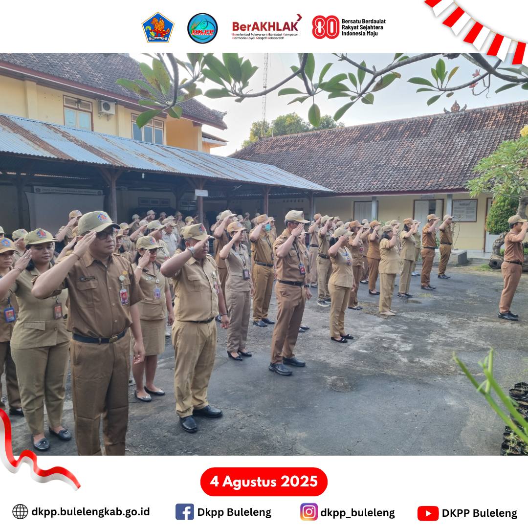 Senin, 4 Agustus 2025 - Apel Pagi Dinas Ketahanan Pangan dan Perikanan (DKPP) Kabupaten Buleleng dalam rangka meningkatkan Rasa Kebangsaan dan Cinta Tanah Air, pengabdian terhadap Negara dan Rakyat Indonesia, serta untuk menjaga sikap kedisplinan di lingkungan Instansi Pemerintahan yang dipimpin Kepala Dinas (I Gede Putra Aryana, S.Sos., M.A.P.) dan diikuti seluruh jajaran. Pada apel ini, Kadis DKPP Buleleng menyampaikan beberapa hal, yaitu mengingat serangkaian agenda kegiatan dalam bulan Agustus ini cukup padat, agar dipersiapkan dan dilaksanakan dengan baik.