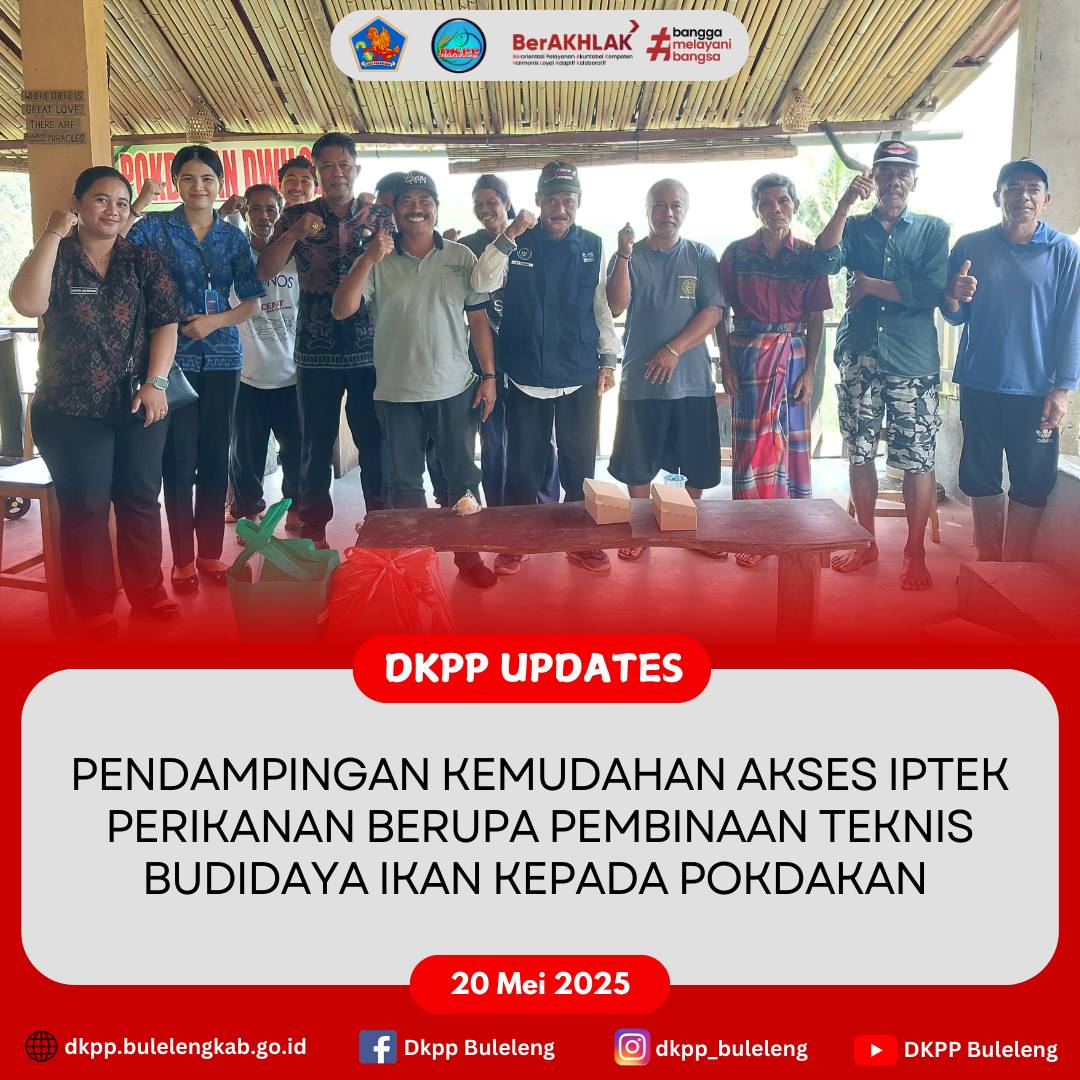 Selasa, 20 Mei 2025 - Dinas Ketahanan Pangan dan Perikanan (DKPP) Kabupaten Buleleng melalui Bidang Pemberdayaan Masyarakat Perikanan melaksanakan Pendampingan Kemudahan Akses Ilmu Pengetahuan dan Teknologi (IPTEK) Perikanan berupa Pembinaan Teknis Budidaya Ikan pada Kelompok Pembudidaya Ikan yaitu Pokdakan Dwiloka, Desa Kayuputih dan Pokdakan Mina Amerta Buana, Desa Gunung Sari, Kecamatan Banjar. Kegiatan ini dilaksanakan oleh Fungsional Analis Pasar Hasil Perikanan (Nyoman Sura Yadnya, S.Pd.) beserta staf dan didampingi Penyuluh Perikanan Buleleng di wilayah binaan setempat.