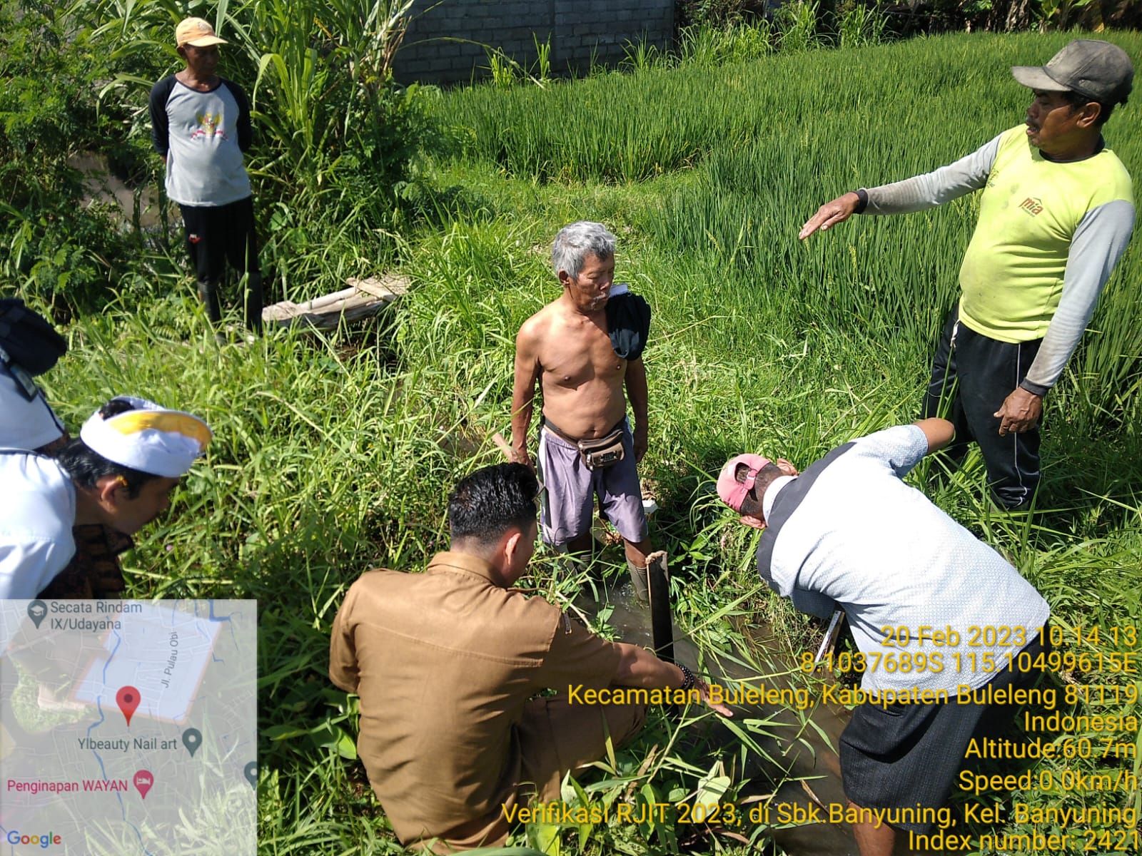 Melalui Bidang Prasarana dan Sarana Pertanian (PSP) Dinas Pertanian Kabupaten Buleleng Kegiatan verifikasi RJIT (Rehabilitasi Jaringan Irigasi Tersier) di Subak Banyuning Kelurahan Banyuning. Kegiatan ini dilakukan oleh Analis Prasarana dan Sarana Pertanian beserta staf, Klian Subak Banyuning, pengurus UPKK (Unit Pengelola Keuangan dan Kegiatan). Agenda verifikasi diantaranya penentuan titik nol persen saluran irigasi yang akan diperbaiki, pengukuran ukuran saluran serta mendisign bentuk dan gambaran awal saluran guna mengkalkulasi target Panjang saluran yang akan direhabilitasi sesuai dengan jumlah anggaran yang diperoleh. Dengan adanya kegiatan RJIT diharapkan dapat meningkatkan fungsi dari saluran irigasi yang dapat berdampak pada luas areal tanam padi dan indeks pertanaman padi di sawah yang semakin meningkat dan efisiensi penggunaan air menjadi lebih optimal.