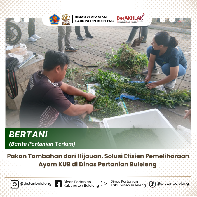 Dalam upaya meningkatkan produktivitas dan efisiensi pemeliharaan ayam Kampung Unggul Balitbangtan (KUB), di lingkungan Kantor, Dinas Pertanian Kabupaten Buleleng melakukan inovasi dengan membuat pakan tambahan berupa hijauan alami. Pembuatan pakan tambahan berupa hijauan untuk pakan ternak ayam merupakan salah satu upaya strategis dalam meningkatkan efisiensi dan keberlanjutan sistem peternakan. Hijauan seperti daun singkong, daun pepaya, dan daun bayam memiliki kandungan nutrisi yang cukup baik, terutama protein nabati, vitamin, dan mineral yang dibutuhkan ayam untuk mendukung pertumbuhan, kesehatan, dan produktivitasnya.