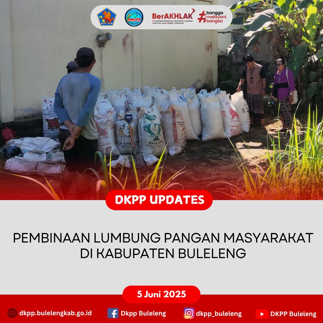 Kamis, 5 Juni 2025 - Dinas Ketahanan Pangan dan Perikanan (DKPP) Kabupaten Buleleng melalui Bidang Distribusi dan Cadangan Pangan melaksanakan Pembinaan Lumbung Pangan Masyarakat (LPM) kepada LPM Subak Gapoktan Merta Sari, Desa Bebetin, Kecamatan Sawan. Kegiatan dihadiri Analis Ketahanan Pangan (Nyoman Sukerni, S.H., M.Pd.) bersama staf.