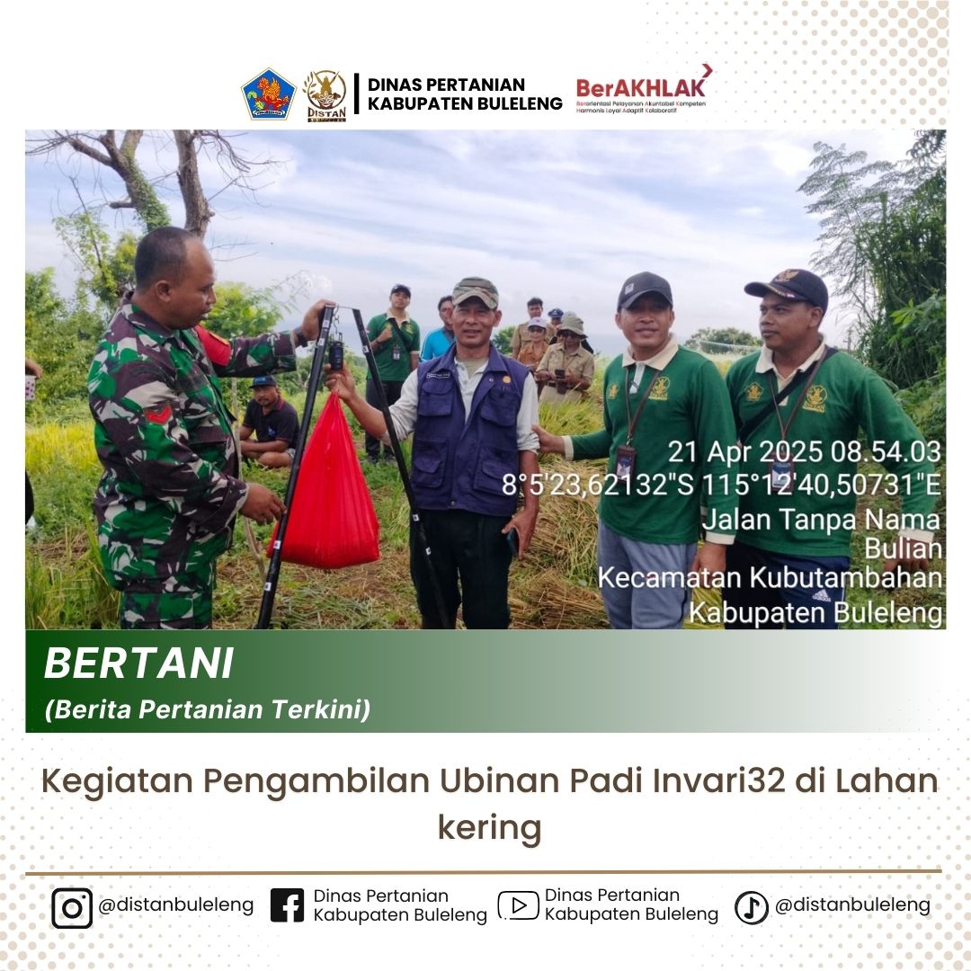 Senin, 21 April 2025 telah dilaksanakan pengambilan ubinan padi Padi Bantuan Pemerintah Varietas invari 32 dilahan kering dengan total luas tanam 0,30 Ha yang berlokasi di Poktan Trinadi Desa Bulian.Kecamatan Kubutambahan.