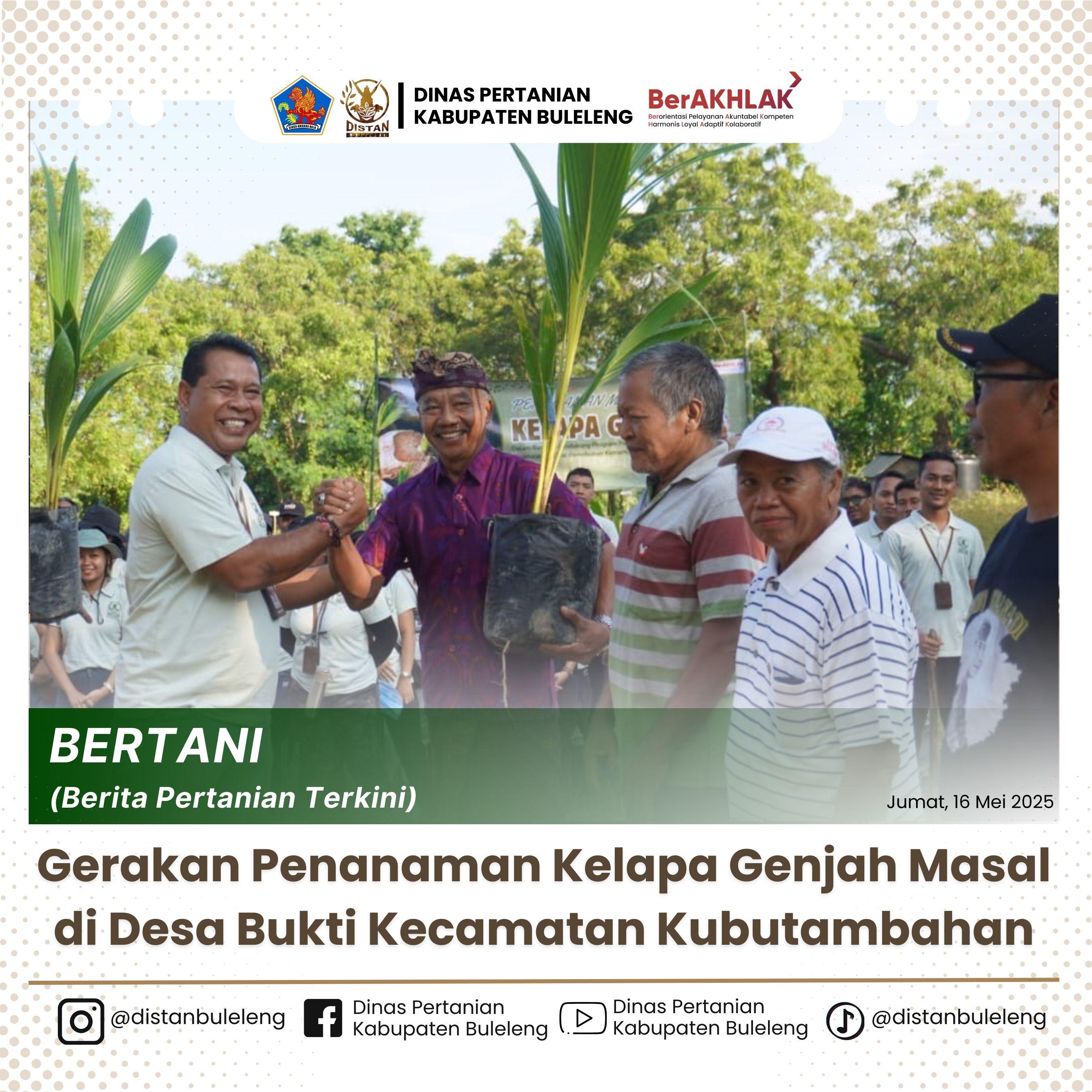 Dinas Pertanian Kabupaten Buleleng melaksanakan kegiatan penanaman masal 200 bibit kelapa genjah kuning Bali di lahan adat Sanih, Desa Bukti, Kecamatan Kubutambahan pada hari Jumat 16 Mei 2025. Kegiatan ini merupakan bagian dari program pengembangan kelapa yang diinisiasi oleh Direktorat Jenderal Perkebunan, Kementerian Pertanian Republik Indonesia, dengan tujuan mewujudkan kemandirian dan meningkatkan kesejahteraan petani melalui optimalisasi komoditas kelapa unggulan.