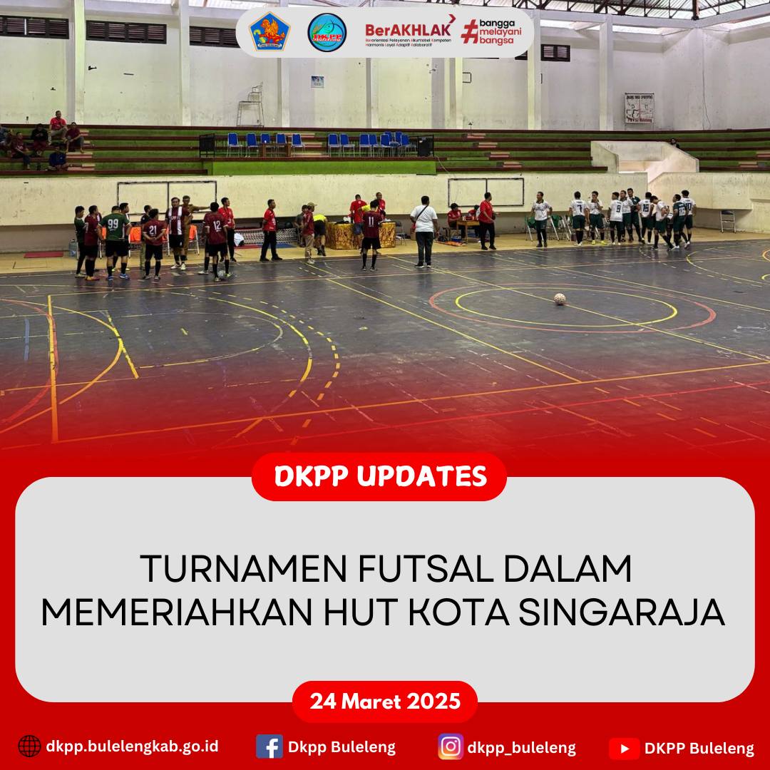 Senin, 24 Maret 2025 - Bertempat di GOR Bhuana Patra - Singaraja, Dinas Ketahanan Pangan dan Perikanan (DKPP) Kabupaten Buleleng ikut berpartisipasi pada Turnamen Futsal antar Instansi dan BUMD lingkup Pemkab Buleleng dalam serangkaian Peringatan HUT ke-421 Kota Singaraja Tahun 2025.