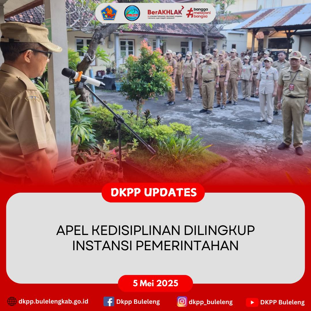 Senin, 5 Mei 2025 - Apel Pagi Dinas Ketahanan Pangan dan Perikanan (DKPP) Kabupaten Buleleng dalam rangka menjaga sikap kedisplinan di lingkungan Instansi Pemerintahan yang dipimpin Kepala Dinas (I Gede Putra Aryana, S.Sos., M.A.P.) dan diikuti seluruh jajaran.