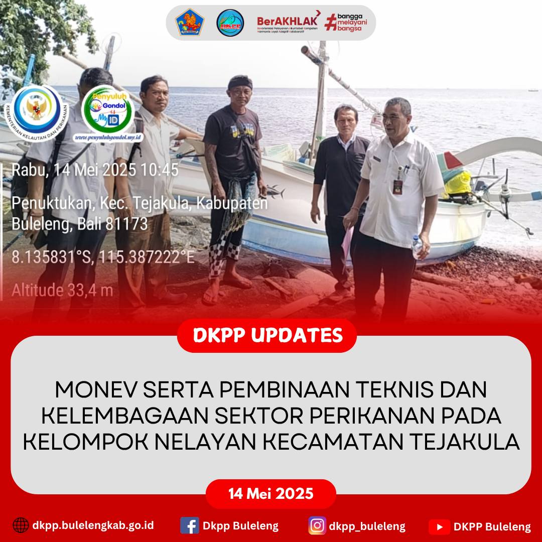 Rabu, 14 Mei 2025 - Dinas Ketahanan Pangan dan Perikanan (DKPP) Kabupaten Buleleng melaksanakan Monev serta Pembinaan Teknis dan Kelembagaan Sektor Perikanan pada beberapa Kelompok Nelayan / Kelompok Usaha Bersama (KUB) di Kecamatan Tejakula yaitu diantaranya KUB Sari Segara, KUB Segara Hati, dan KUB Segara Cahaya. Kegiatan dihadiri perwakilan Bidang Perikanan DKPP Buleleng, para anggota Kelompok Nelayan, dan Penyuluh Perikanan Buleleng.