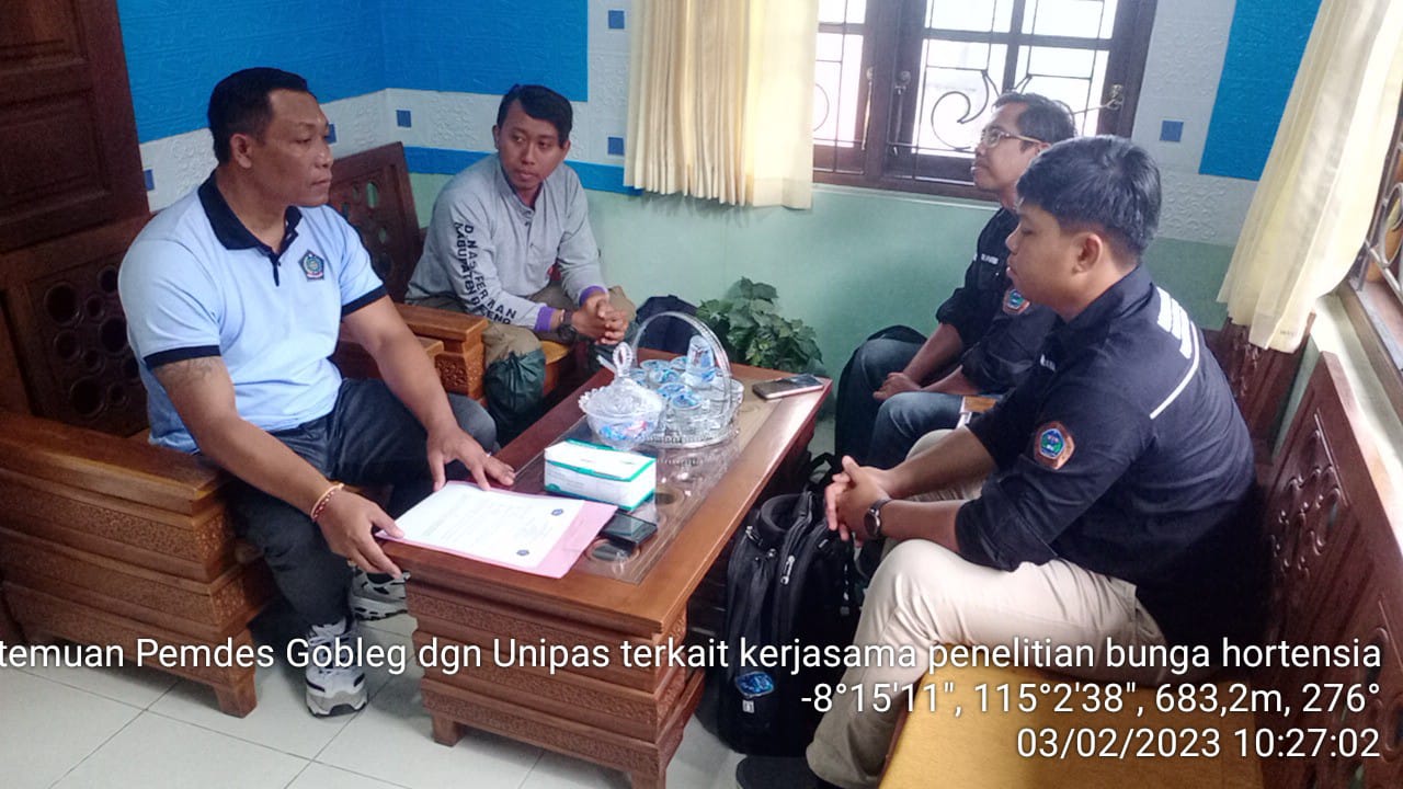 Menindaklanjuti kerjasama Desa Gobleg kepada Universitas Panji Sakti di bidang pertanian subsektor florikuktur komoditi bunga hortensia mengenai pencegahan penyebaran hama dan penyakit pada bunga hortensia, Jumat (3/2/2023) Dekan Fak. Pertanian Universitas Panji Sakti I Putu Parmila bersama Kaprodi Agroekoteknologi Putu Shantiawan melakukan kunjungan ke Desa Gobleg diterima oleh Perbekel Desa Gobleg bersama PPL Wilbin. Kegiatan pertemuan dilakukan membahas munculnya permasalahan pada Komoditi Bunga hortensia, dimana komoditi tersebut sebagai penggerak perekonomian di desa, maka menjadi skala prioritas utk desa membantu memecahkan permasalahan tersebut dgn mengajak para akademisi dari UNIPAS.