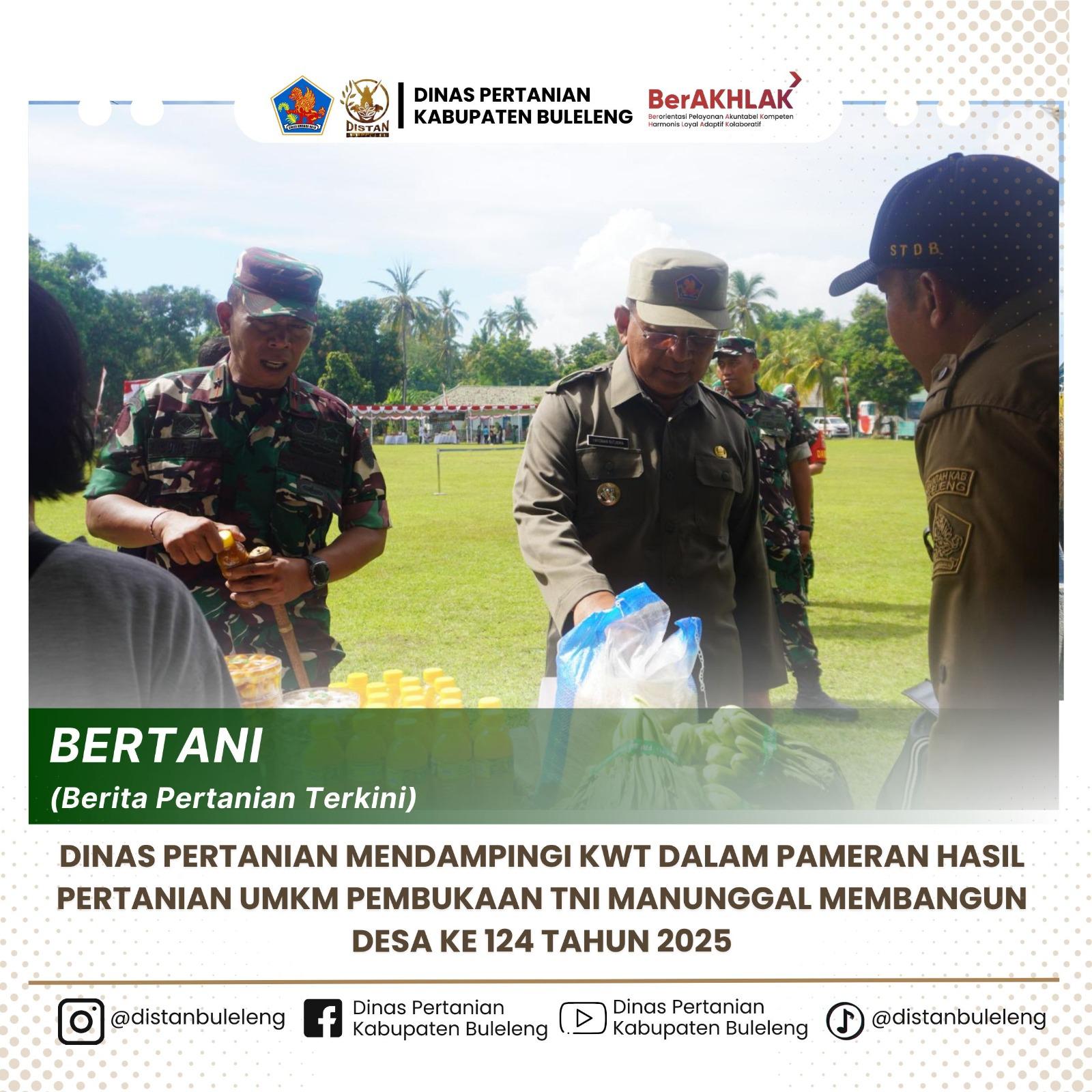 Selasa, 6 Mei 2025 berlokasi di Kompi Senapan B/C Yonif 900/SBW AIR SANIH Desa Kubutambahan, Kecamatan Kubutamabahan, Dinas Pertanian Kabupaten Buleleng hadir mendampingi Kelompok Wanita Tani dari Kecamatan Kubutambahan dalam memasarkan hasil pertanian dan olahannya. Adapun produk yang di pamerkan dan dipasarkan seperti sayuran pakcoy dan selada, pepaya, labu madu, kacang gude, kacang tanah, beras merah, beras padi gogo, tepung mocaf, jamu kunyit sakuntala, VCO, abon ayam, dan aneka kue kering produksi KWT di Kecamatan Kubutambahan.