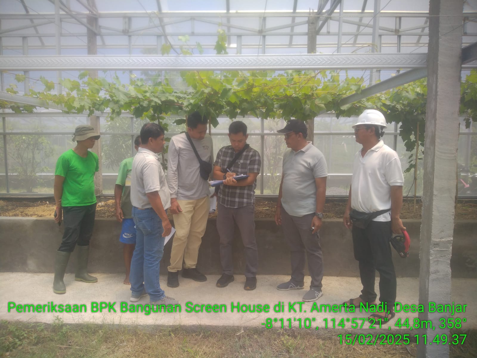 Sabtu, 15 Pebruari 2025, dilakukan pemeriksaan fisik bangunan screen house anggur oleh BPK yang didampingi oleh Kabid Hortikultura, JF PMHP, Penyedia CV. Krisna Putra Bali, Ketua dan Pengurus Poktan Amerta Nadi.