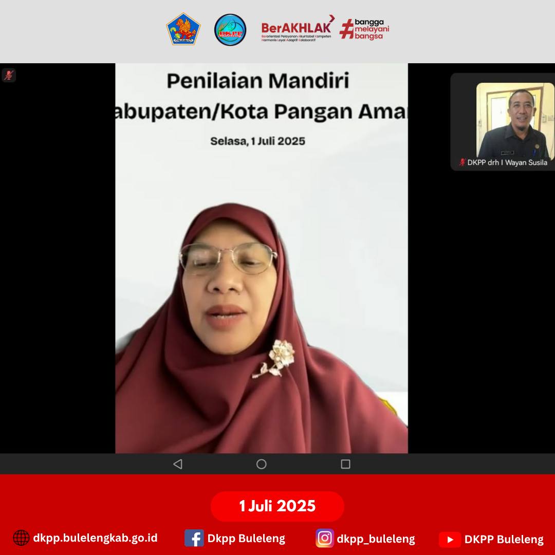 Selasa, 1 Juli 2025 - Dinas Ketahanan Pangan dan Perikanan (DKPP) Kabupaten Buleleng mengikuti Zoom Meeting Penilaian Mandiri Kabupaten/Kota Pangan Aman Tahun 2025 yang digelar BPOM Republik Indonesia dan diikuti oleh jajaran Pemerintah Daerah.