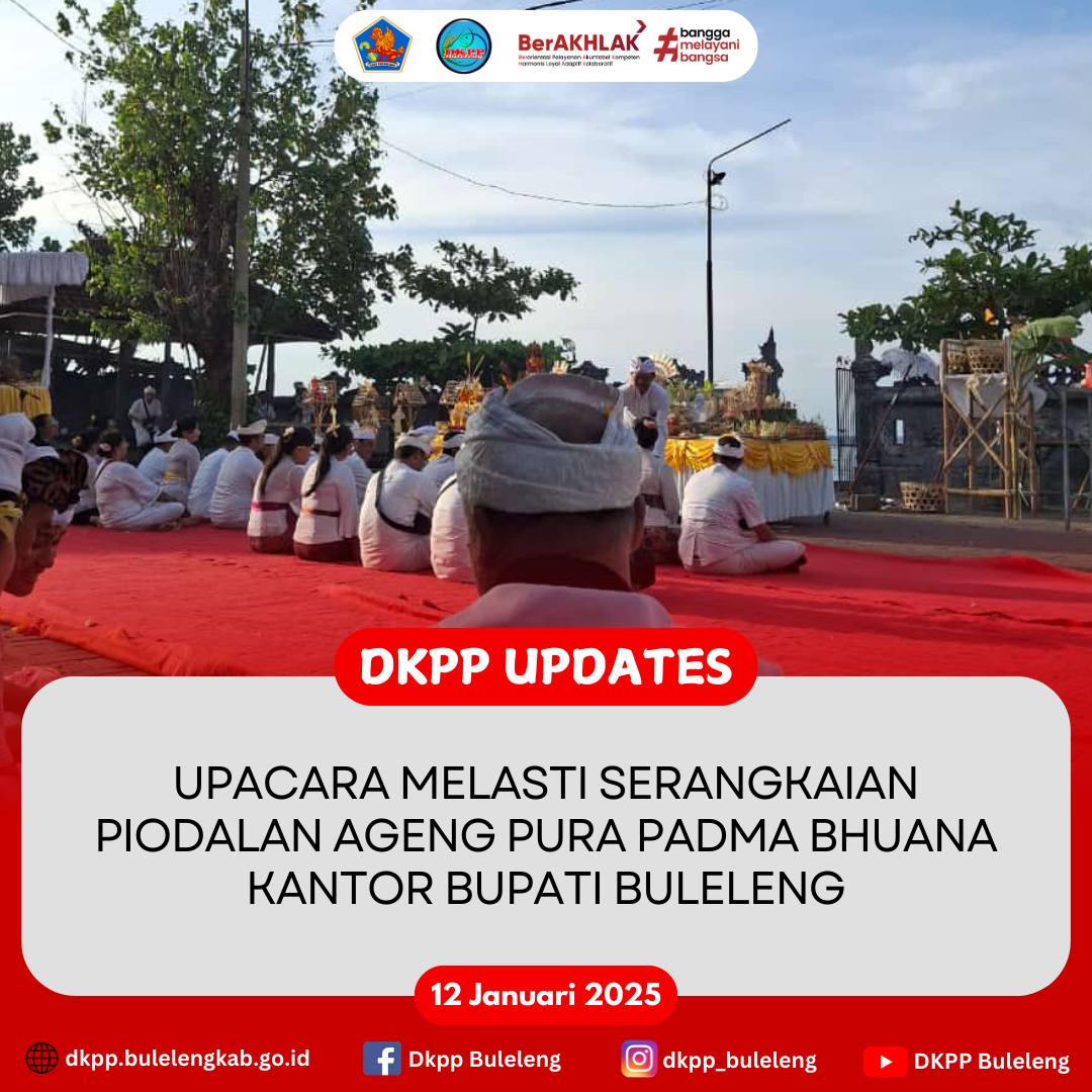 Minggu, 12 Januari 2025, Dinas Ketahanan Pangan dan Perikanan (DKPP) Kabupaten Buleleng mengikuti Upacara Melasti menuju Pura Segara Buleleng yang merupakan rangkaian nyanggra Piodalan Ageng Pura Padma Bhuana Kantor Bupati Buleleng. Puncak rangkaian piodalan tersebut jatuh pada Rahina Purnamaning Sasih Kapitu, Anggara, 14 Januari 2025.