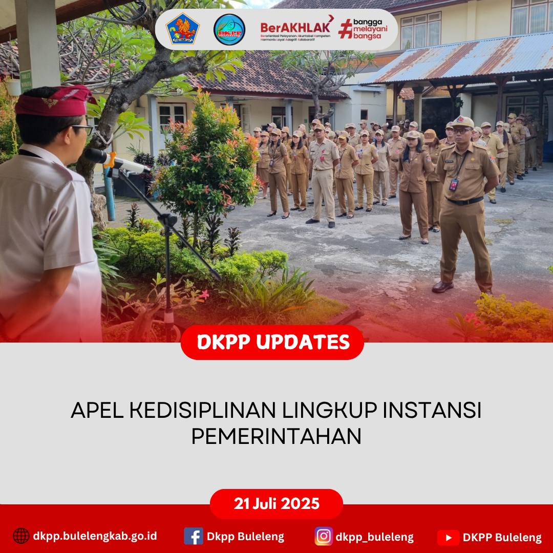 Senin, 21 Juli 2025 - Apel Pagi Dinas Ketahanan Pangan dan Perikanan (DKPP) Kabupaten Buleleng dalam rangka menjaga sikap kedisplinan di lingkungan Instansi Pemerintahan yang dipimpin Kepala Dinas (I Gede Putra Aryana, S.Sos., M.A.P.) dan diikuti seluruh jajaran.