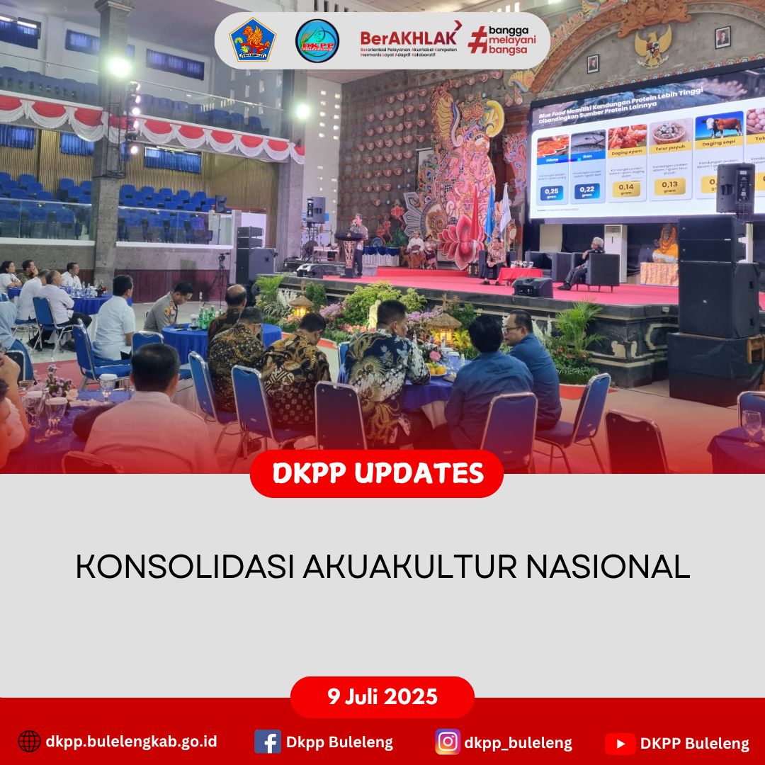 Rabu, 9 Juli 2025 - Kepala Dinas Ketahanan Pangan dan Perikanan Kabupaten Buleleng I Gede Putra Aryana, S.Sos., MAP. bersama Kabid Pemberdayaan Masyarakat Perikanan menghadiri Konsolidasi Akuakultur Nasional yang merupakan Serangkaian Kegiatan Rapat Kerja Nasional (Rakernas) Dewan Pengurus Pusat Masyarakat Akuakultur Indonesia (DPP MAI) bertempat di Auditorium Undiksha - Singaraja. Kegiatan ini dihadiri langsung oleh Menteri Kelautan dan Perikanan Republik Indonesia Sakti Wahyu Trenggono, dan Wakil Bupati Buleleng Gede Supriatna SH. yang sekaligus dikukuhkan sebagai Ketua Dewan Pimpinan Daerah MAI.