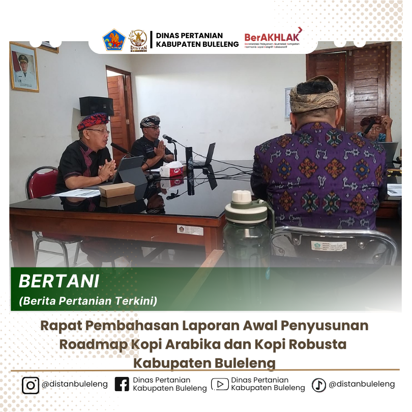 Pada hari Kamis 10 April 2025 Kepala Bidang Perkebunan Mengikuti Rapat Pembahasan Laporan Awal Penyusunan Roadmap Kopi Arabika dan Kopi Robusta Kabupaten Bulelen yang diselenggarakan oleh Badan Riset dan Inovasi Daerah Kabupaten Buleleng. Rapat dipimpin oleh Bapak Drs. Made Supartawan,MM selaku Kepala Badan Riset dan Inovasi Daerah, dilaksanakan di Ruang Rapat Brida Kabupaten Buleleng dan diikuti oleh Perwakilan dari Bappeda, Perwakilan dari BPKPD, perwakilan dari Dinas Pariwisata, perwakilan dari Inspektorat Kabupaten Buleleng, perwakilan dari Diskopukam Kab. Buleleng, perwakilan dari DKPP kab. Buleleng, perwakilan dari Bagian Hukum Setda Kab. Buleleng, perwakilan dari Kecamatan Busungbiu, Perwakilan dari Kecamatan Sukasada, Perwakilan dari Kecamatan Banjar, Perwakilan dari Kecamatan Sawan, Perwakilan dari Kecamatan Kubutambahan, Perwakilan dari PD Swatantra, Ketua LPPM Undiksa, Ketua LPPM Unipas, Ketua LPPM STAH Negeri Empu Kuturan, Tim Pelaksana dari Universitas Warmadewa, Tim Teknis Penyusunan Roadmap Komoditas unggulan komoditi kopi kabupaten buleleng yang terdiri dari perwakilan dari Sekretariat Daerah Kabupaten Buleleng, Badan Perencanaan Pembangunan Daerah Kabupaten Buleleng, Dinas Pertanian Kabupaten Buleleng, Dinas Perdagangan, Perindustrian dan Koprasi, Usaha Kecil dan Menengah Kabupaten Buleleng dan Tim Persiapan Penyusunan Roadmap komoditas unggulan kopi Kabupaten buleleng, Koordinator BPP Busungbiu, Sawan, Banjar, Seririt, Kubutambahan dan perwakilan dari petani kopi di Kabupaten Buleleng