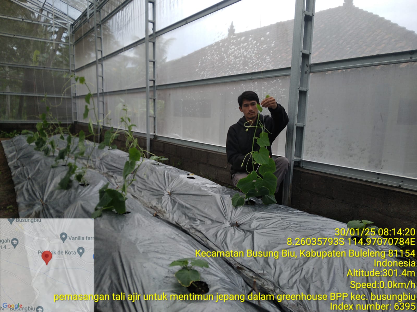 Pemasangan ajir hendaknya dilakukan sebelum tanaman tumbuh besar. Biasanya sebelum umur tanaman 3 hari terhitung sejak pertama ditanam. Pemasangan ajir menggunakan tali atau benang pada tanaman timun di green house bpp busungbiu dilakukan pada hari kamis, 30 Januari 2025.