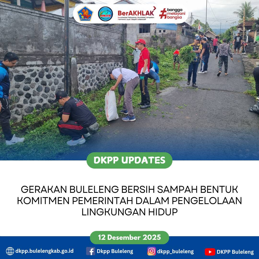 Jumat, 12 Desember 2025 - Dinas Ketahanan Pangan dan Perikanan (DKPP) Kabupaten Buleleng melaksanakan Gerakan Buleleng Bersih Sampah berlokasi di lingkungan Banjar Juwuk Manis, Desa Alasangker, Kecamatan Buleleng sebagai tindaklanjut Surat Bupati Buleleng tentang Gerakan Buleleng Bersih Sampah yang disusun berdasarkan :