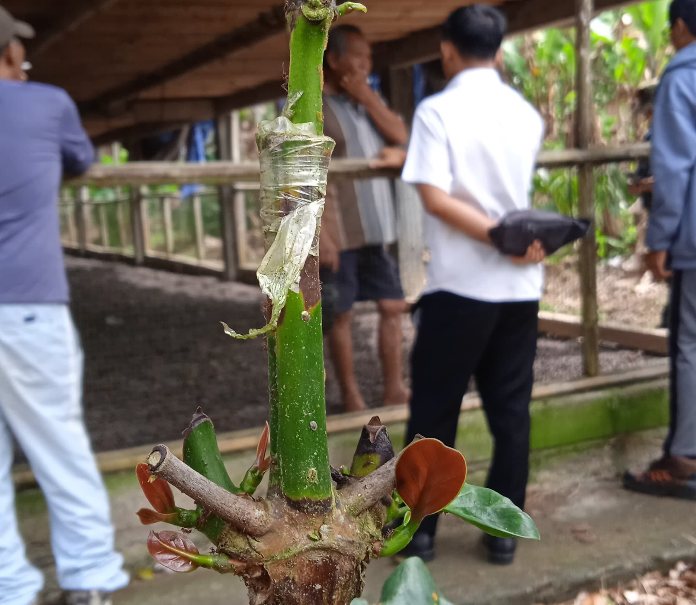 Hasil Grafting/sambungan bisa kita lepas sungkupnya ketika sudah muncul tunas atau daun muda. Maka melihat bukti nyata yang sudah ada di lahan petani kopi, selain petani bisa memiliki klon/varietas yang bagus, juga bisa memperpanjang masa produktif tanaman kopi yang umumnya 10-20 tahun, tetapi jika sudah menerapkan teknik Grafting dengan klon yang cocok di lingkungannya , maka masa produktif hasil tanaman kopi bisa maksimal ,30-35 tahun.