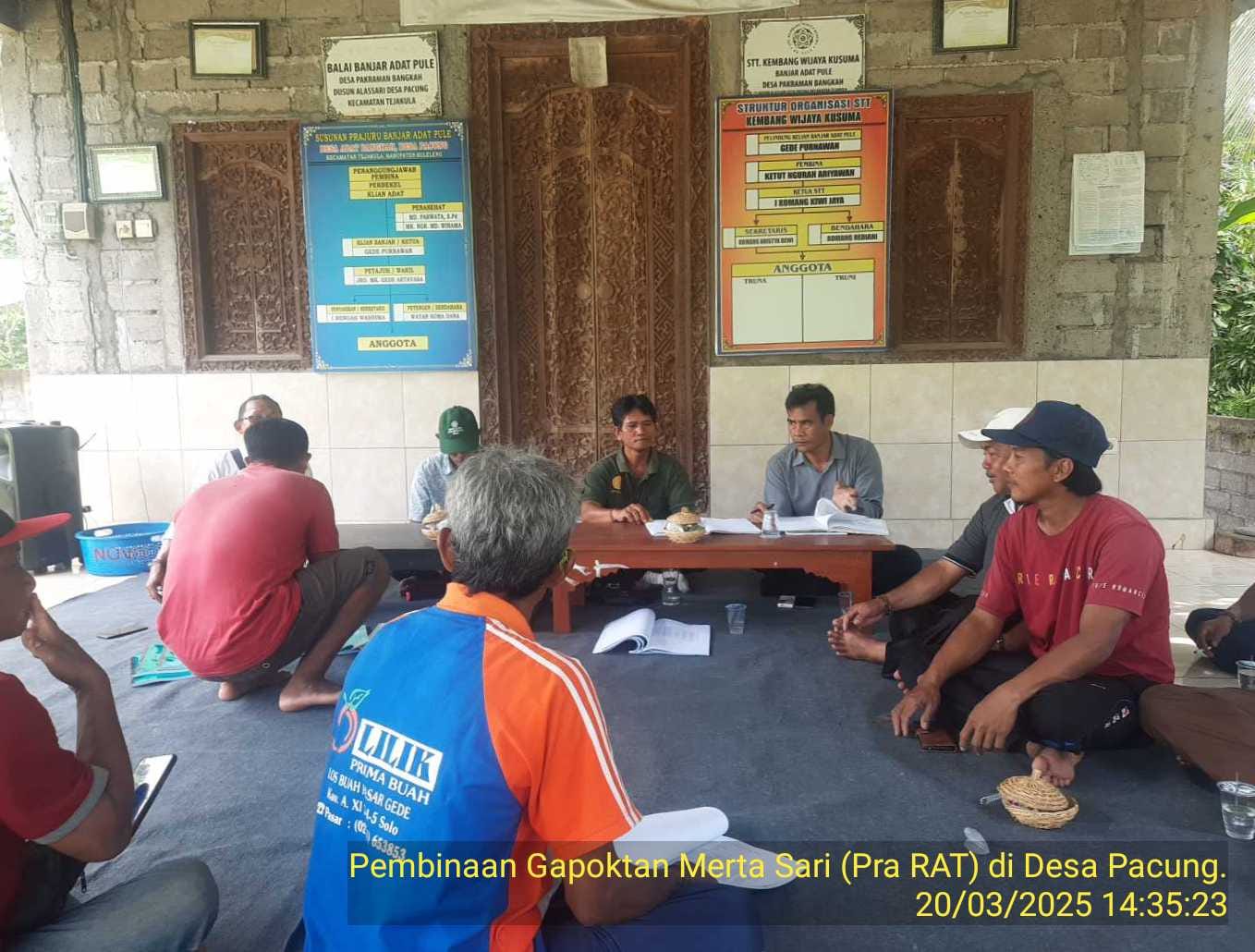Tejakula, 20 Maret 2025 Penyuluh wilbin Pacung menghadiri Pra RAT Gapoktan Merta Sari di Balai Kelompok Tani Pule Desa Pacung, kegiatan pra RAT ini dihadiri oleh pengurus Gapoktan dan ketua poktan dan KWT dengan mengajak masing-masing poktan/kwt 3 orang anggota.