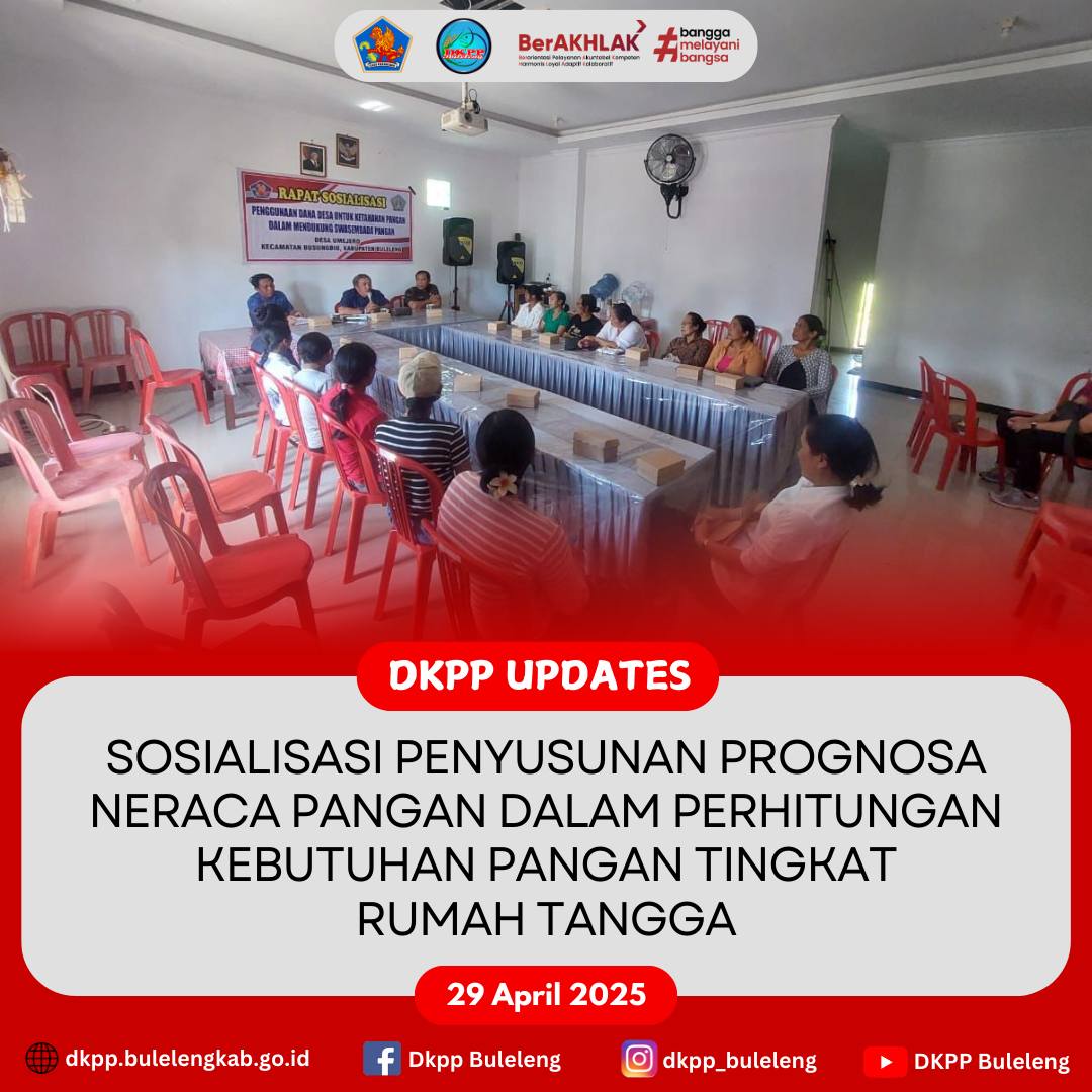 Selasa, 29 April 2025 - Dinas Ketahanan Pangan dan Perikanan (DKPP) Kabupaten Buleleng melalui Bidang Ketersediaan dan Kerawanan Pangan melaksanakan kegiatan Sosialisasi Penyusunan Prognosa Neraca Pangan Dalam Perhitungan Kebutuhan Pangan pada tingkat Rumah Tangga di Desa Umejero, Kecamatan Busungbiu. Kegiatan dihadiri Kabid Ketersediaan dan Kerawanan Pangan (drh. I Wayan Susila) beserta staf terkait yang didampingi oleh aparatur desa setempat.