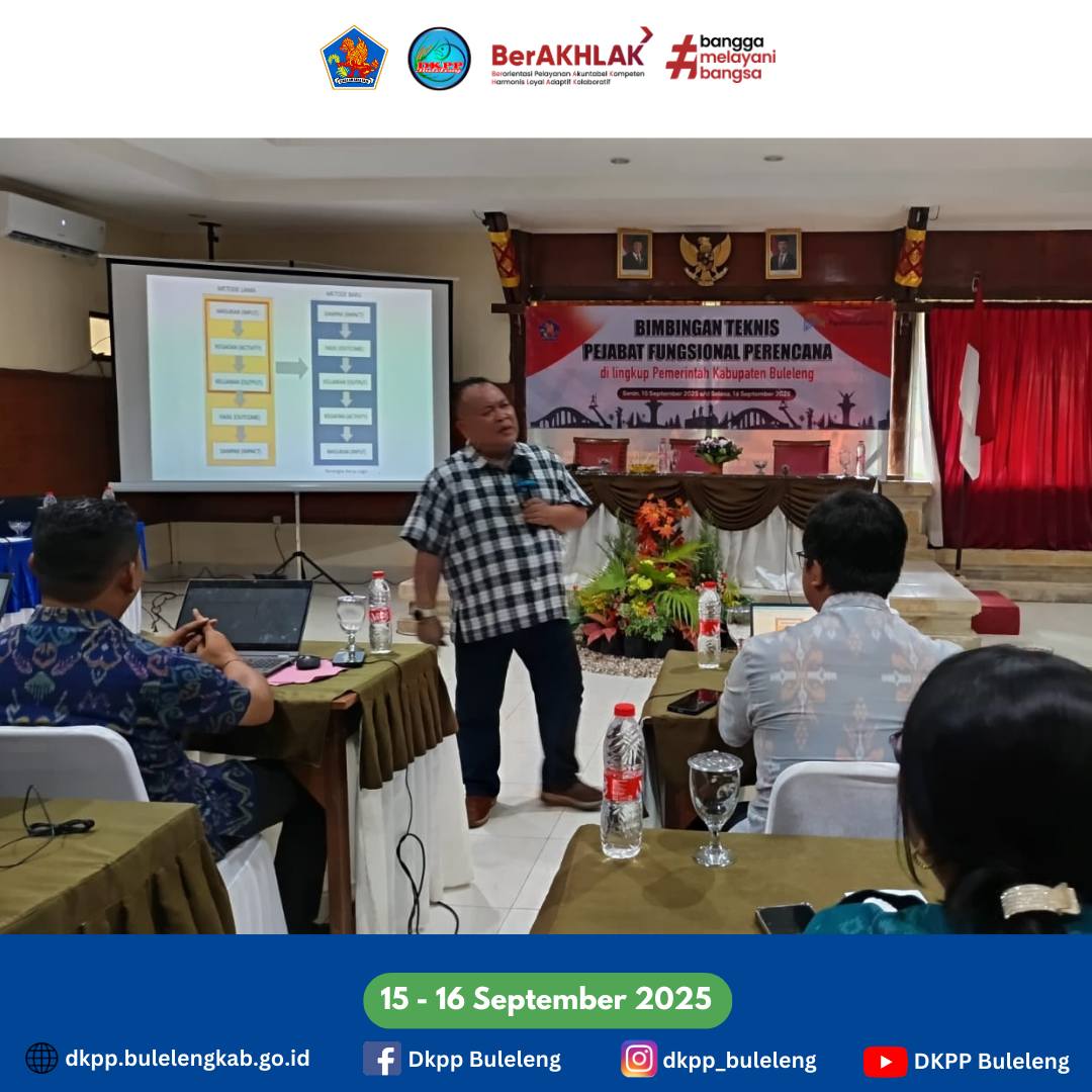 Dinas Ketahanan Pangan dan Perikanan (DKPP) Kabupaten Buleleng yang dihadiri Perencana (Dewa Gede Rahjana Suthama, S.Pi) mengikuti Bimbingan Teknis Jabatan Fungsional Perencana dilingkup Pemkab Buleleng bertempat di Aneka Hotel Lovina selama dua hari, yaitu pada tanggal 15 - 16 September 2025. Kegiatan bimtek ini diselenggarakan oleh BKPSDM Bulelen yang bekerjasama dengan Pusbindiklatren Bappenas.