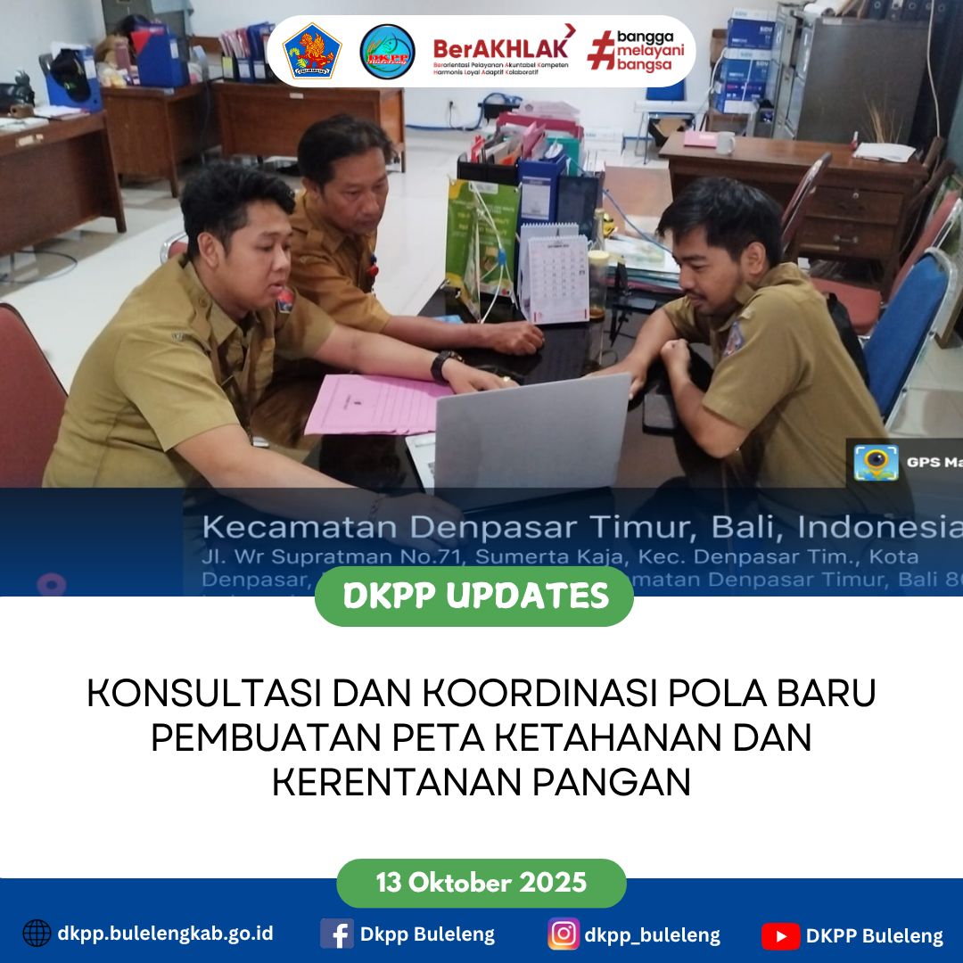 Dinas Ketahanan Pangan dan Perikanan (DKPP) Kabupaten Buleleng melalui Bidang Ketersediaan dan Kerawanan Pangan melakukan Konsultasi dan Koordinasi Pembuatan Peta Ketahanan dan Kerentanan Pangan / Food Security and Vulnerability Atlas (FSVA) dengan menggunakan Pola Baru bertempat di Dinas Pertanian dan Ketahanan Pangan Provinsi Bali. (13/10)