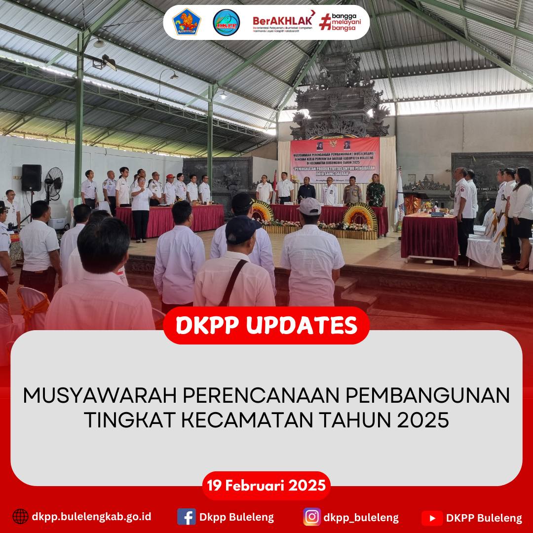 Rabu, 19 Februari 2025 - Dinas Ketahanan Pangan dan Perikanan (DKPP) Kabupaten Buleleng mengikuti kegiatan Musyawarah Perencanaan Pembangunan Tingkat Kecamatan (Musrenbangcam) Tahun 2025 dengan tema "Peningkatan Produktivitas Untuk Penguatan Daya Saing Daerah". Kegiatan ini dilaksanakan di beberapa berlokasi yaitu Kecamatan Busungbiu Seririt, dan Gerokgak yang dihadiri para Perbekel/Kepala Desa dan Camat, jajaran SKPD Kabupaten Buleleng, Penyuluh Perikanan Buleleng, dan unsur terkait lainnya.