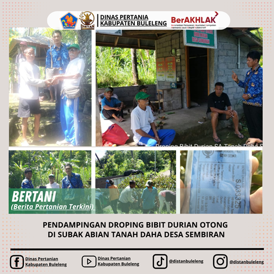 Pada hari Senin, 1 Desember 2025 Koordinator P2K Tejakula dan PPL Desa Sembiran melakukan pengawalan dan pendampingan pembagian bibit durian jenis Otong bertempat di Balai Subak Abian Tanah Daha Desa Sembiran yang bersumber dari dana APBD 1. Pada saat pembagian dihadiri oleh penggurus subak dan anggota SA Tanah Daha serta dari penyedia bibit UD Hidup Tunas Mekar