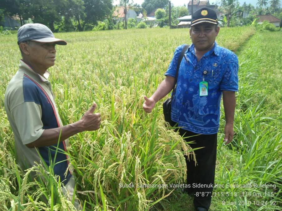 Selasa, 8/1/2019, Kasi Perbenihan dan Perlindungan Tanaman Pangan Dinas Pertanian Kabupaten Buleleng melaksanakan kegiatan pengamatan Padi Varietas Sidenuk di Subak Sambangan, Desa Sambangan, Kecamatan Sukasada, dengan tujuan untuk mengetahui produksi atau produktivitas padi sidenuk.