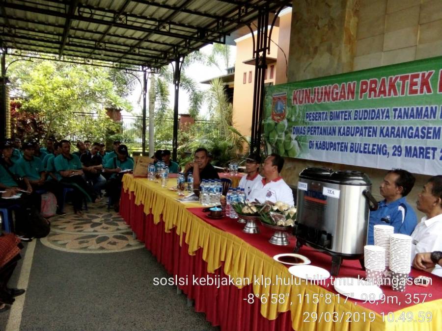 Kemudian hari Jumat, .29 Maret 2019, kembali Distan Karangasem berkunjung ke Kabupaten Buleleng belajar mengetahui perkembangan kelapa ,mulai dari perkembangan pembibian kelapa ( hulu) sampai perkembangan produksi kelapa di hilir (akhir). Petani yang tergabung dalam Gapoktan yang berjumlah 30 orang serta diikuti oleh Koordinator.PPL Manggis dengan mengajak seluruh Penyuluh se Kec.Karangasem. Rombongan langsung diantar oleh bapak Ir.Komang Cenik, M.Si selaku Kepala Bidang Perkebunan. Dalam kegiatan itu ikut juga Ibu Susanti (Distan Karangasem),Bapak Made Kudiana dan Bapak Made Merta (UPT).Bapak Kabidbun Distan Kab.Buleleng Putu Oka Sastra, SP.MMA, yang hadir menerima rombongan di Lokasi Pembibitan di Desa Sinabun.Bapak Kabidbun memaparkan keberadaan dan perkembangan Kelapa di Buleleng, dari hulu hingga akhir. Sedangkan Penyuluh Kab.Bidang bun, Ketut Sumantia,SP. Memaparkan tentang tehnik pembinaan Kelompok ,Subak Abian, KWT di dalam meningkatkan produksi, membuat olahan produk ( VCO, Coconut Nargil, Nata Cocoa, Jus Nata Cocoa, dll serta meningkatkan kemampuan didalam berorganisasi dan mencari peluang pasar dari hasil hilir komoditi kelapa.