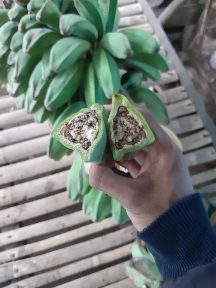 Berdasarkan hasil pengamatan yang dilakukan pada hari selasa, tanggal 30 April 2019 oleh POPT Dinas Pertanian Kab. Buleleng wilker Kec. Tejakula, ditemukan Gejala Penyakit pada tanaman pisang milik petani tersebut yaitu :
