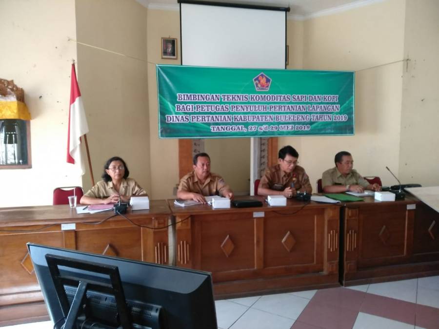 Kegiatan Bimbingan Teknis komoditas ternak sapi dan kopi bagi petugas penyuluh pertanian lapangan Kabupaten Buleleng yang dilaksanakan pada hari senin s/d rabu tanggal 27 s/d 29 Mei 2019, jumlah peserta 90 orang yang terdiri dari penyuluh pertanian lapangan PNS, THL - TB PP Kontrak Daerah,koordinator balai penyuluhan pertanian se Kabupaten Buleleng dan penyuluh pertanian lapangan swadaya. Hari pertama materi kesehatan hewan, pengolahan kopi sistem pengambilan data pertanian dari badan statistik Kabupaten Buleleng dan pemasaran kemasan hasil pertanian dari Dinas Perindustrian dan Perdagangan Kabupaten Buleleng setelah diberikan materi dari masing - masing narasumber dilanjutkan dengan kegiatan studi lapangan untuk komoditas kopi, kunjungan keplaku usaha perkopian yang sudah Go Internasional sedangkan untuk komoditas ternak sapi kunjungan ke Breeding Centre Sapi Bali di BPTU HPT Bali yang berlokasi di Kabupaten Jembrana.