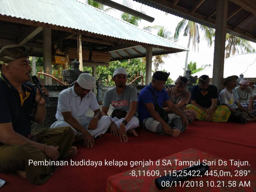 Kegiatan Pembinaan Budidaya Tanaman Kelapa Genjah di Subak Abian Tampul Sari Desa Tajun Kec. Kubutambahan yang dilaksanakan pada Hari Kamis, 08 Nopember 2018 oleh Bidang Perkebunan Kabupaten Buleleng, Koordinator BPP Kec. Kubutambahan, PPL Wilbin Tajun, serta Anggota Subak Abian Tampul Sari.