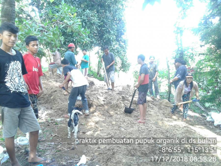Adapun Kegiatan tersebut yaitu Pencampuran Kotoran Sapi dan Jerami serta pemberian EM4 sebagai Dekomposer (Pengurai), Setelah itu Campuran tersebut di tutup dengan Terpal sampai 3-5 Hari. Setelah Waktu tersebut, campuran tersebut dibuka dan diaduk kembali dan diberi EM4. Kemudian ditutup kembali dengan terpal. Tujuan Kegiatan tersebut, agar anggota Kelompok Tani Dwi Karya mampu memproduksi pupuk organik sendiri dan anggota dapat membuat pupuk untuk tanamannya sendiri dan memperingan biaya pembelian pupuk kimia. Diharapkan kegiatan pembuatan pupuk organik bisa diikuti oleh masyarakat lain diluar Kelompok di desa Bulian.