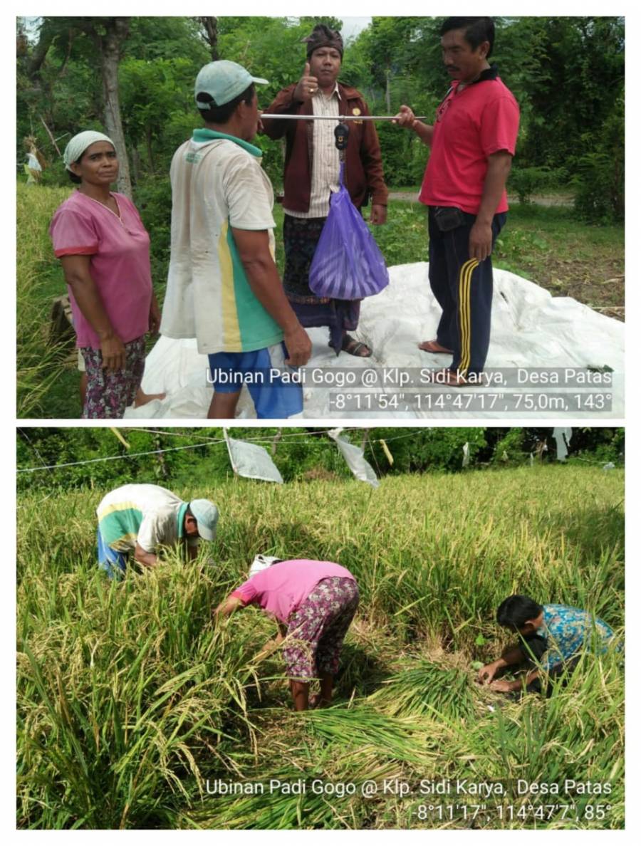 Ubinan merupakan salah satu cara untuk memperoleh data produktivitas suatu tanaman. Data produktivitas ubinan biasanya digunakan untuk memperkirakan potensi hasil tanaman dari suatu luasan tertentu. Pada ilmu statistika, ubinan merupakan sampel/contoh. Data produktivitas hasil ubinan banyak digunakan untuk mengumpulkan data produktivitas terutama tanaman padi dan palawija. Teknik pengubinan dilakukan dengan memilih blok pada tempat dan luasan tertentu yang mewakili sebagian dari luas lahan yang akan diperkirakan potensi hasilnya. Luas ubinan yang biasa digunakan adalah 6,25 m2 (2,5 x 2,5 m). Untuk wilayah Kecamatan Gerokgak, tepatnya di Desa Patas, kegiatan pengambilan ubinan dilakukan pada hari Kamis (18/4/2019) di Kelompok Sidi Karya. Kegiatan ini dihadiri oleh Mantri Tani, Penyuluh, Pembantu Mantri Tani, dan petani. Seperti yang diketahui, padi gogo adalah tanaman pertanian yang diusahankan di lahan kering pada di daerah yang bercurah hujan rendah atau pada bagian teratas dari suatu daerah berlereng yang tidak/kurang mampu menampung air relatif lama.