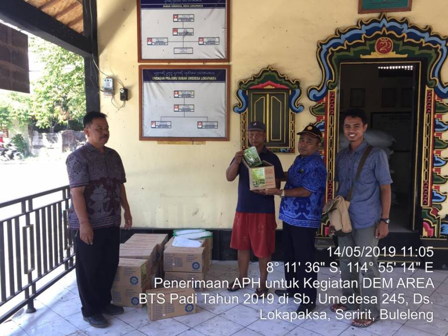 Kegiatan Demonstrasi Area Budidaya Tanaman Sehat Padi (Dem Area BTS Padi) tahun 2019 untuk Kabupaten Buleleng tersebar ditiga subak yang ada di Kecamatan Seririt, yaitu Subak Umedesa 245 (Lokapaksa), Subak Umedesa 234 (Kalianget), dan Subak Ringdikit (Ringdikit). Kegiatan DemArea BTS padi untuk Subak Umedesa 245 rencananya akan dimulai pada musim tanam bulan Agustus 2019 dengan total luasan 100 ha. Adapun saprodi yang diperoleh yaitu dolomit (100 ton), pupuk organik (50 ton), benih padi varietas inpari 42 (2,5 ton) agensia pengendali hayati (APH), serta tanaman refugia.