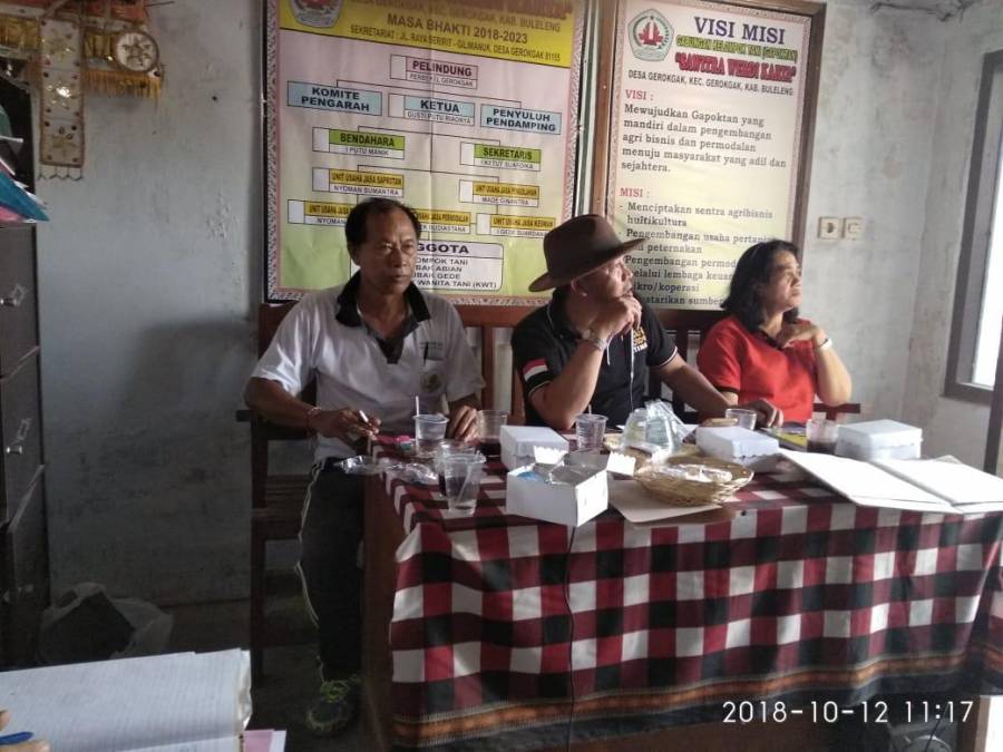 Jumat, 12 Oktober 2018 bertempat di Sekretariat Gapoktan Sawitra Werdi Karya, Desa Gerokgak, Kecamatan Gerokgak, Buleleng, telah diadakan sosialisasi bantuan hibah ternak sapi . Hadir dalam kegiatan sosialisasi ini Kabid PKH Dinas Pertanian Buleleng yang membidangi peternakan, PPL wilbin dan anggota kelompok tani.
