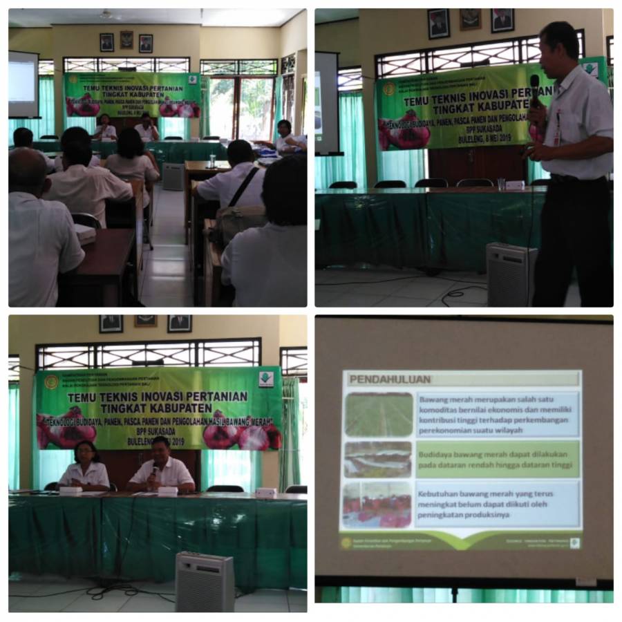 Sesui surat no: B.977/TU.020/H.12.1605/2019 tanggal 2 Mei 2019 diadakan Kegiatan temu teknis inovasi bawang merah yg dilalsanakan oleh BPTP Bali pada tanggal 8 Mei 2019 bertempat di BPP Kecamatan Sukasada. Kegiatan diikuti oleh 25 peserta yang terdiri dari para koordinator penyuluh, PPL dan POPT, serta petugas dari Dinas Kabupaten. Materi mencakup teknik budidaya, pengenalan biopestisida KISELA 866 oleh bapak Nyoman Ngurah Arya, SP.,MP dan beberapa inovasi pengolahan bawang merah seperti camilan dan bawang goreng crispy oleh ibu Dr.Ir. Ni Wayan Trisnawati, MMA. Baik narasumber tentang budidaya maupun pengolahan berasal dari BPTP Bali. Kegiatan berlangsung penuh diskusi yang menarik mulai jam 10.00 hingga jam 16.00 wita.